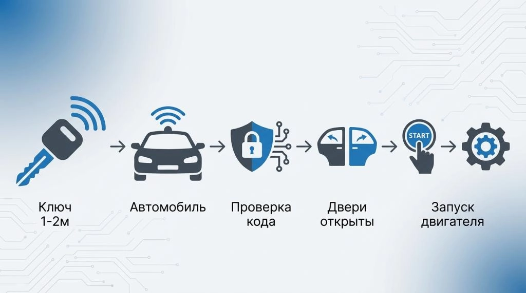 Как работает Keyless Entry: Ключ постоянно излучает радиосигнал малой мощности (обычно на расстоянии 1–2 метра). Когда вы подходите к машине, автомобиль «слышит» сигнал, проверяет криптографический код и разблокирует двери. Нажимаете кнопку старт — двигатель заводится. Всё работает автоматически, без нажатия кнопок на брелоке.